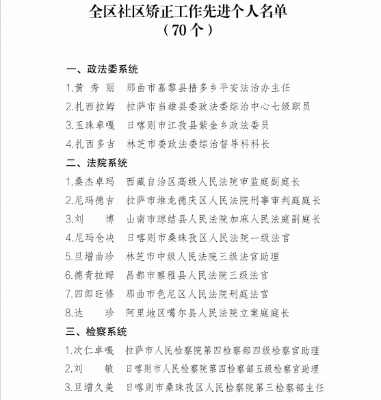 近日,西藏自治区社区矫正委员会决定,授予全区30个集体“全区社区矫正工作先进集体”荣誉称号;授予全区70名同志“全区社区矫正工作先进个人”荣誉称号。其中,昌都4个集体、10名个人获得表彰。