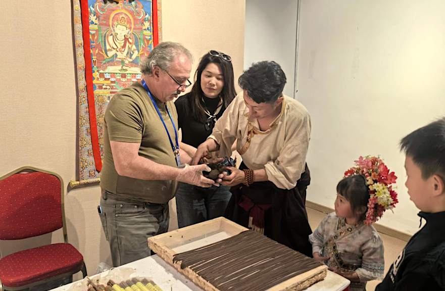 图为参展现场,非遗传承人正在教外国游客如何制作藏香