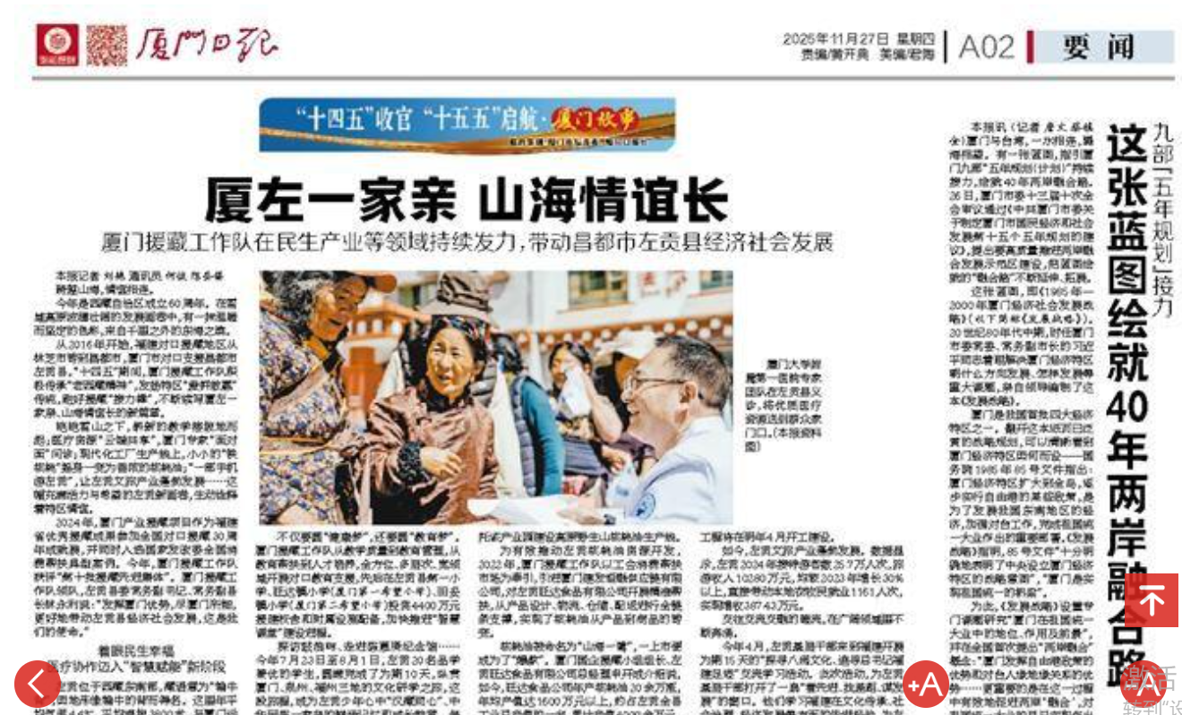 皑皑雪山之下,崭新的教学楼拔地而起;医疗资源“云端共享”,厦门专家“面对面”问诊;现代化工厂生产线上,小小的“铁核桃”摇身一变为香浓的核桃油;“一部手机游左贡”,让左贡文旅产业蓬勃发展……这幅充满活力与希望的左贡新画卷,生动诠释着特区情谊。